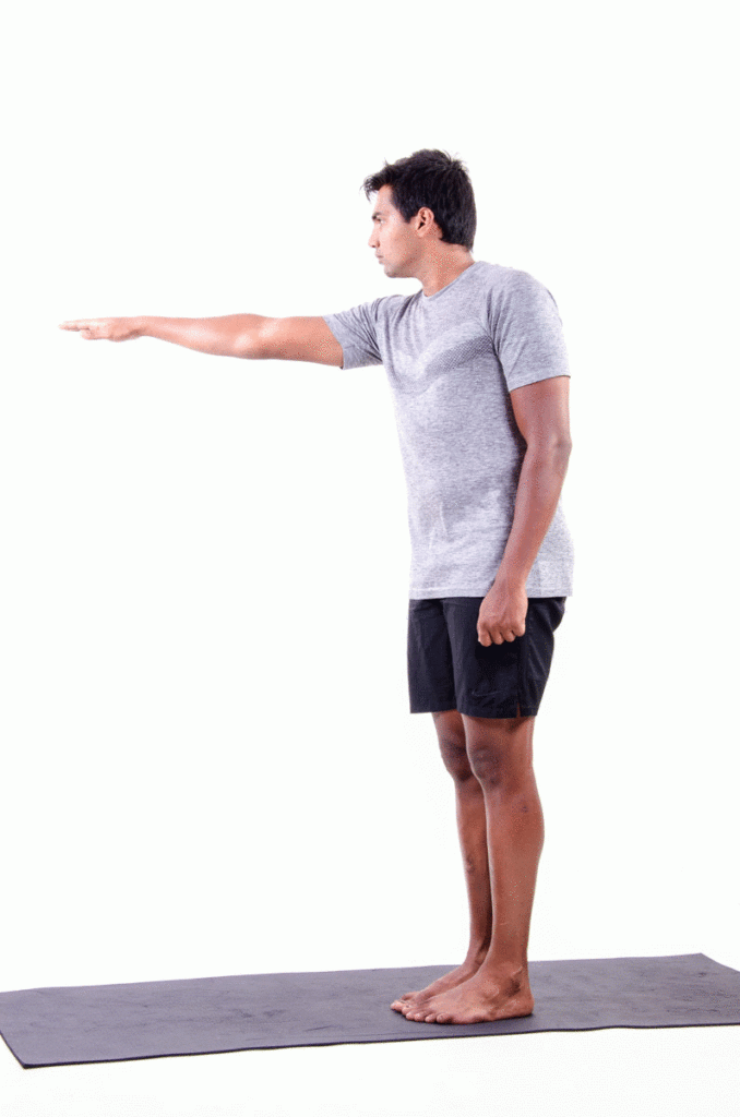 - Reik langzaam met één arm naar voren, opzij of licht omhoog, terwijl je het evenwicht bewaart.